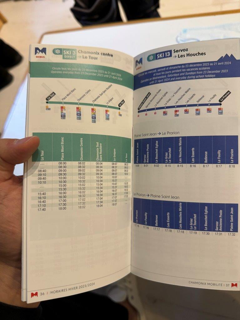 2枚のスノーボードを持って宿泊施設へ戻ります。その道中、シャモニーの玄関口であるバスステーション Chamonix SUD で『バルム』というゲレンデへの行き方を聞きました。フランス人のイケメンのお兄さんに、どうにかこうにか英語で要望を伝えると、反対側のバス亭からバルム行きのバスに乗れるそう。また、そのバス停からは3種類のバスが乗れるみたいで、乗るバスを間違えないようにと時刻表を網羅したパンフレットもいただきました。