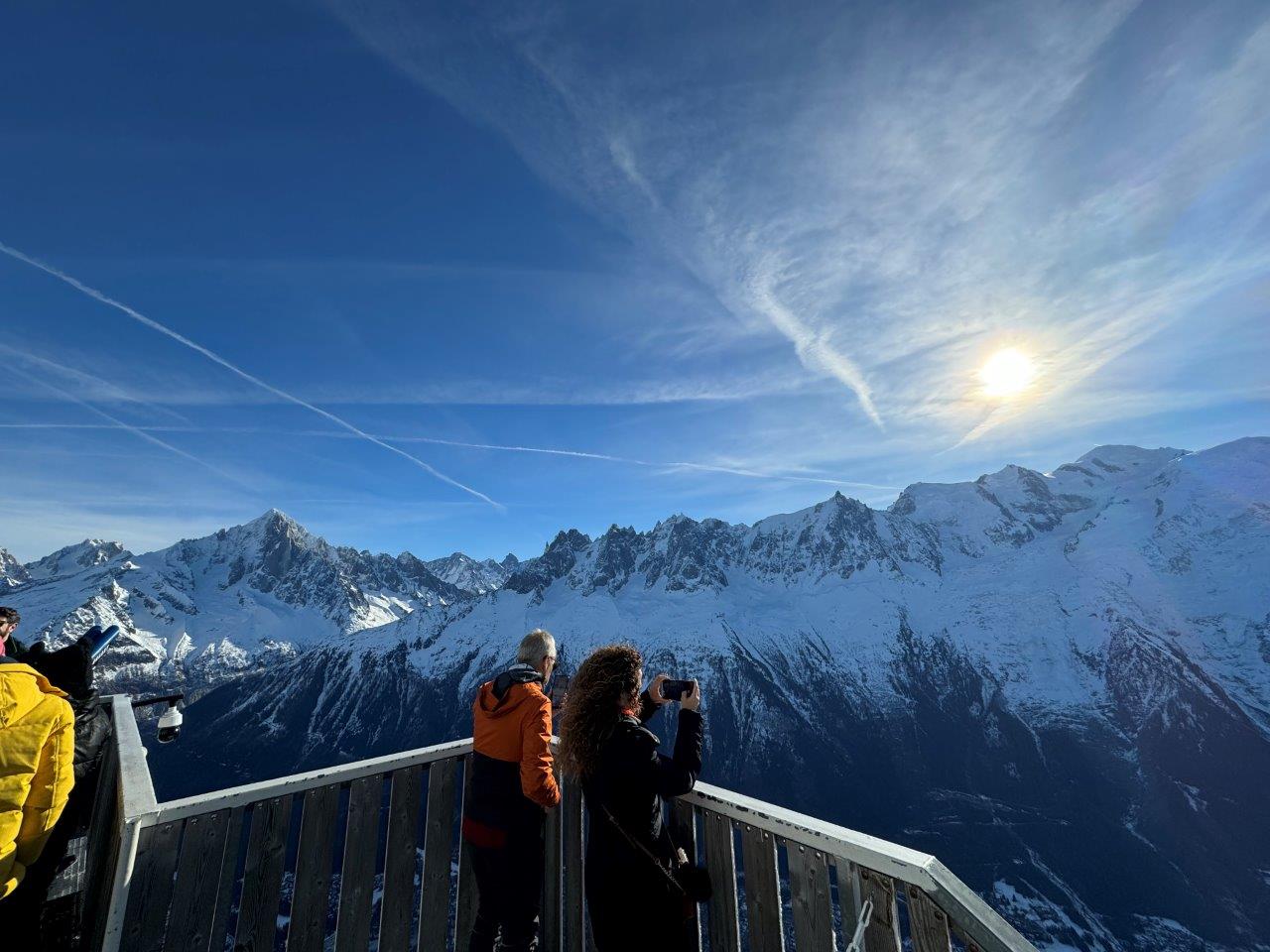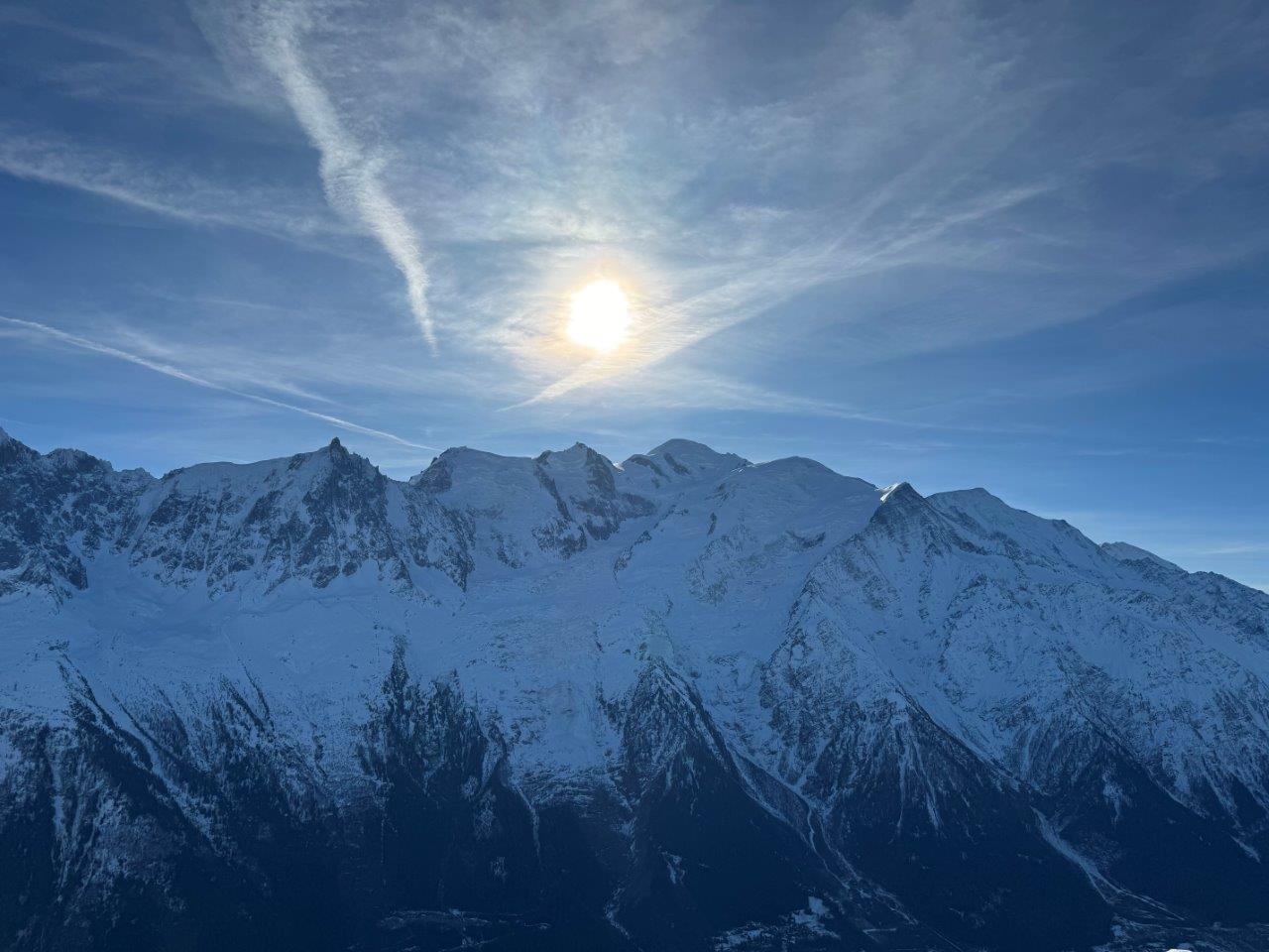 目前にモンブラン。太陽の右下辺りの一番高さのある山がそれです。
